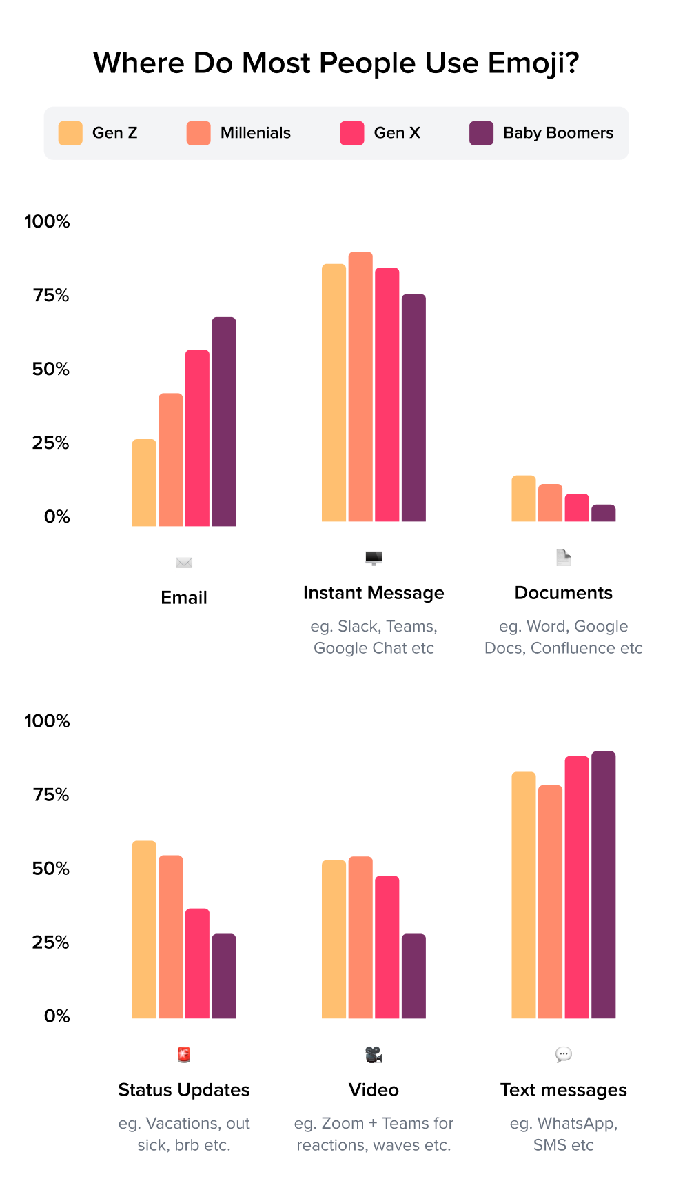 Interestingly, across all generations, documents are mostly kept emoji-free. Gen Z (15%) may sometimes sprinkle them in, but you probably won’t see a 😇 or 🐶 in a doc from a Boomer (6%).