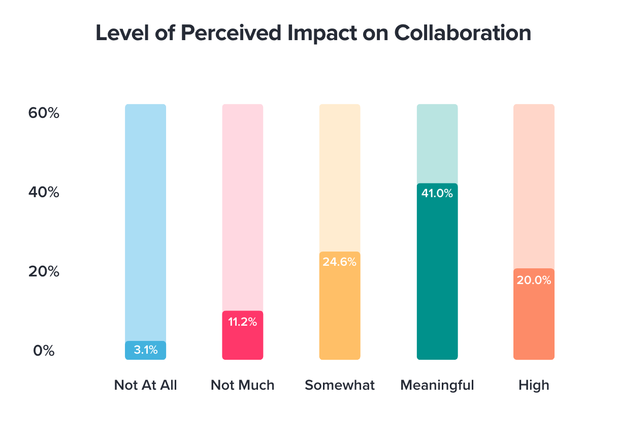 It’s a similar story when it comes to collaboration, which, in a work context, is a work style that supports how people work together in beneficial ways. 86% of respondents said that emojis impact collaboration and 61% shared that that impact is very meaningful.