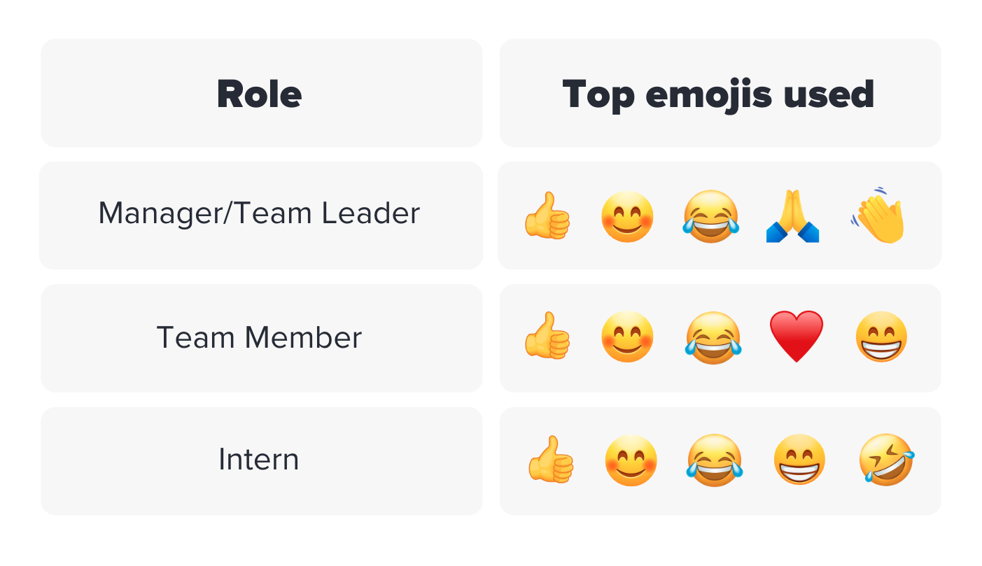 Are you curious about what emojis are the most used by managers in our study? Turns out they’re very similar to the ones used by both team members and interns. While all three groups have the 👍, 😊 and 😂emojis in common, the remaining two are different in flavor.