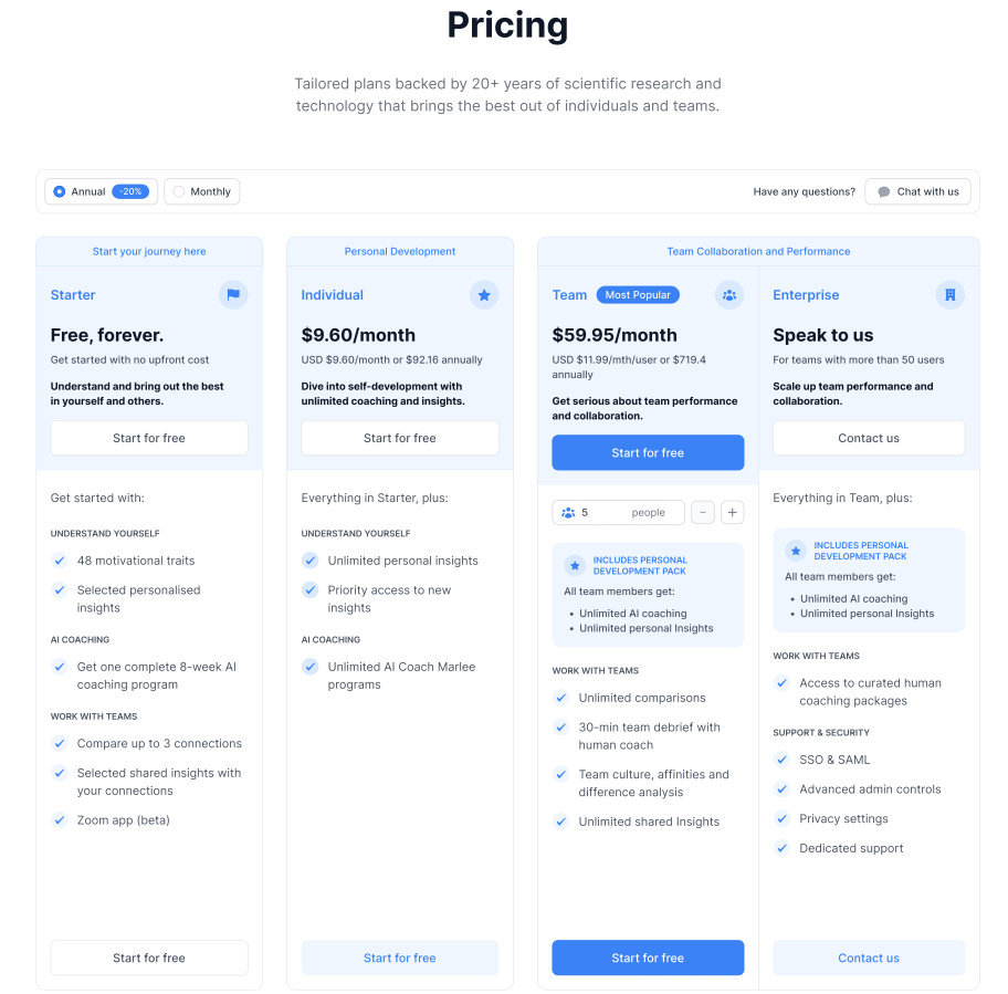 For team collaboration and performance, our Team and Enterprise plans are set up to unleash productivity by tapping into a deep understanding of soft skills within teams. We’ve identified rapidly growing teams as essential to F4S’s mission to bring human development to everyone.