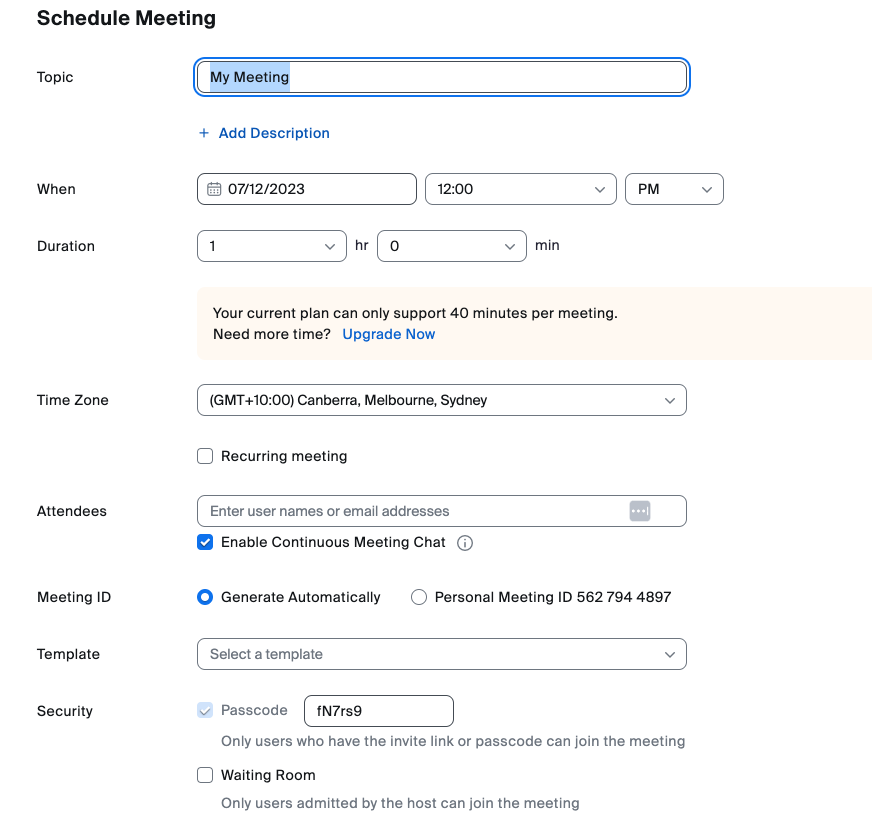 Enter the topic, date, time, and duration of the meeting. There is an optional description, but as per the research mentioned above, we recommend that you fill out a detailed description of the purpose of the meeting.
