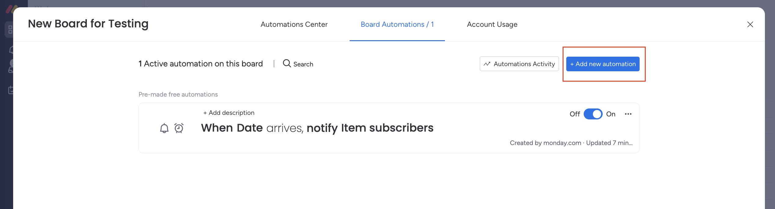By clicking "Automate" at the top of your board, you’ll enter the Automation Center. Use the automation option, "When a status changes to something, archive the item". Then set the rule to archive an item when the status changes to whichever label indicates "done" on your board: