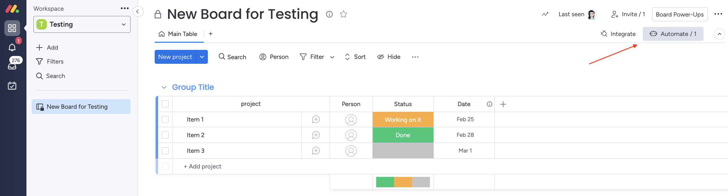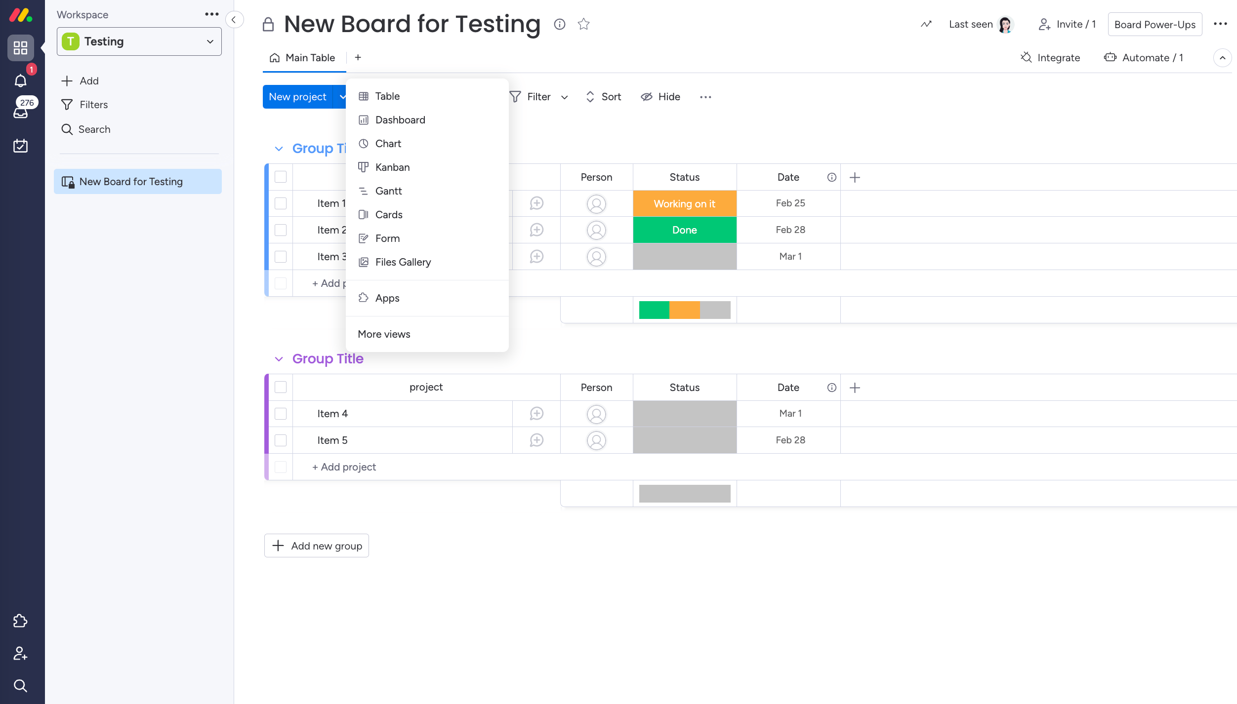 You can choose from various board views, such as kanban or calendar, then customize the colors and background to match your brand. You can then change your view using the plus sign beside the “main table.”