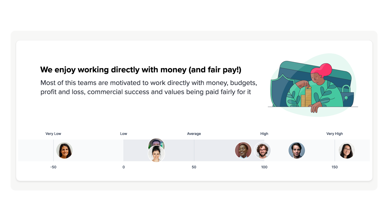 F4S measures 48 different motivations that influence employees' drives for particular tasks, styles of communication, or work environments. For example, if you're a people person who loves to work within a creative team and you thrive on innovation you might score high on: