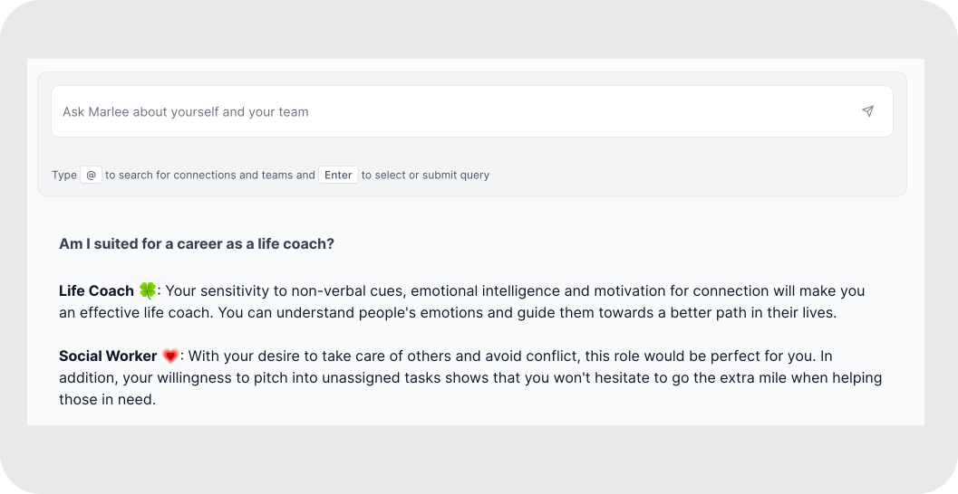 AI coaching incorporates artificial intelligence to provide a tailored coaching experience. At Marlee, our AI, Coach Marlee uses motivational traits to understand user behavior, preferences, and challenges. Once you answer questions on what motivates you, you'll receive your personalized report.